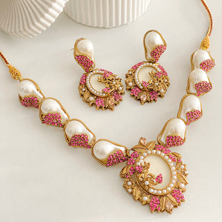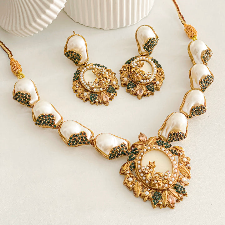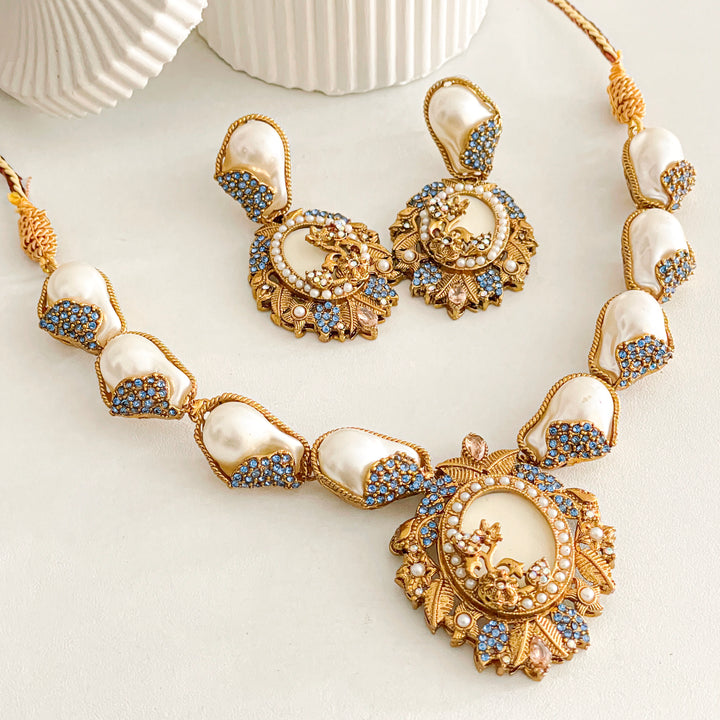Matching stud earrings complete the cohesive and elegant ensemble.