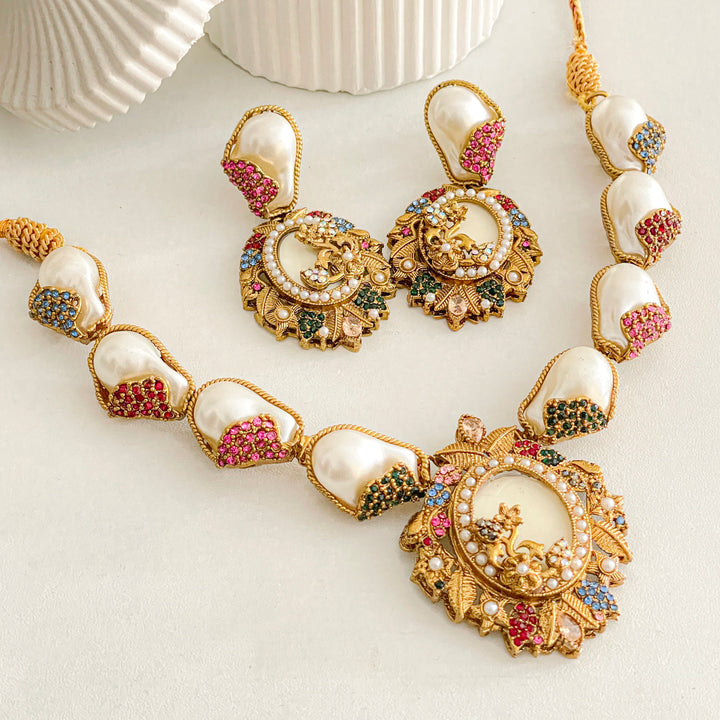 Design: Linked Pearl Necklace Set with Oval Pendant, Multi-Stone & Pearl Accents