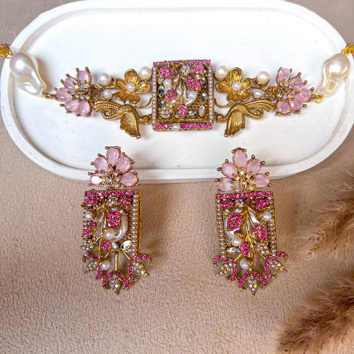 Step into an era of poetic elegance with the Umra-o-Jaan Choker Set. This regal set features an intricately designed choker with floral and bird motifs, adorned with pearls, crystals, and deep-toned embellishments. The detailed craftsmanship brings a Mughal-inspired charm that makes this set perfect for weddings, mehndi, and formal festive wear.