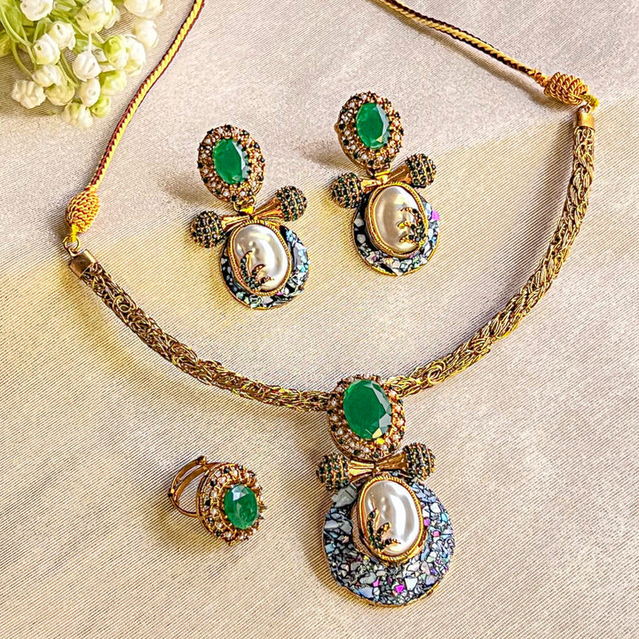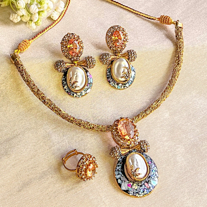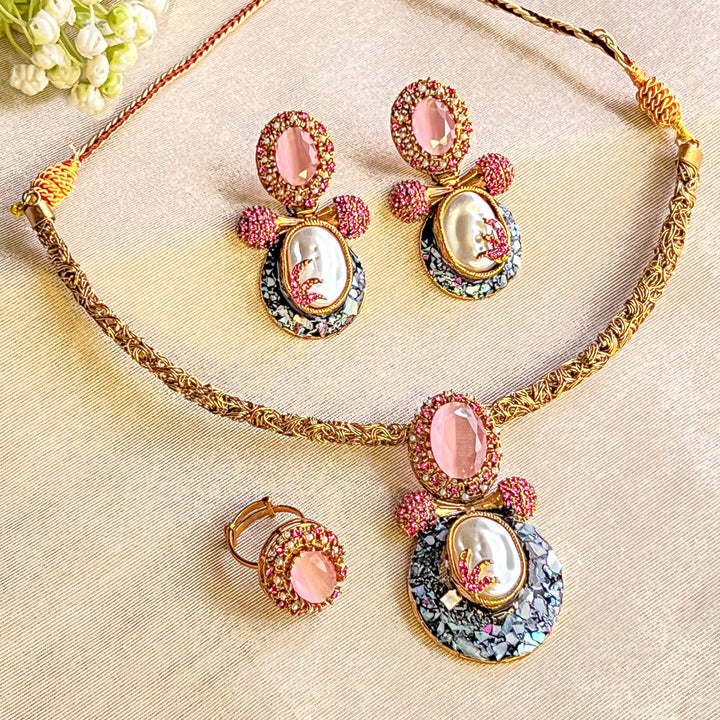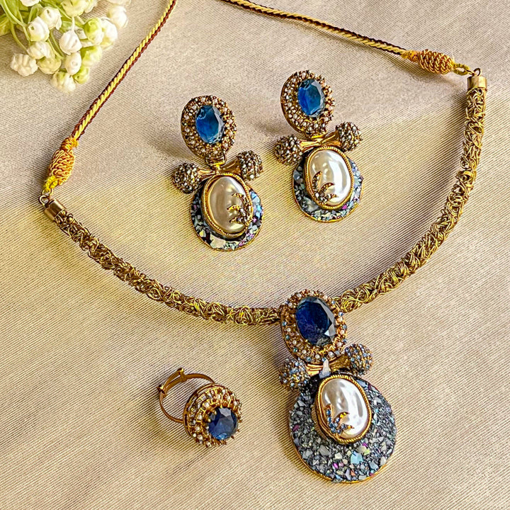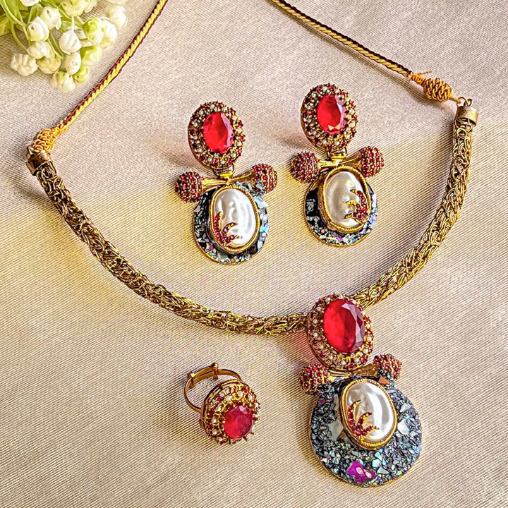 Complete set includes a choker necklace, coordinated earrings, and an adjustable ring
