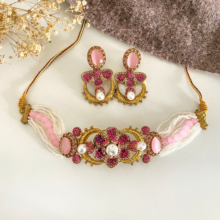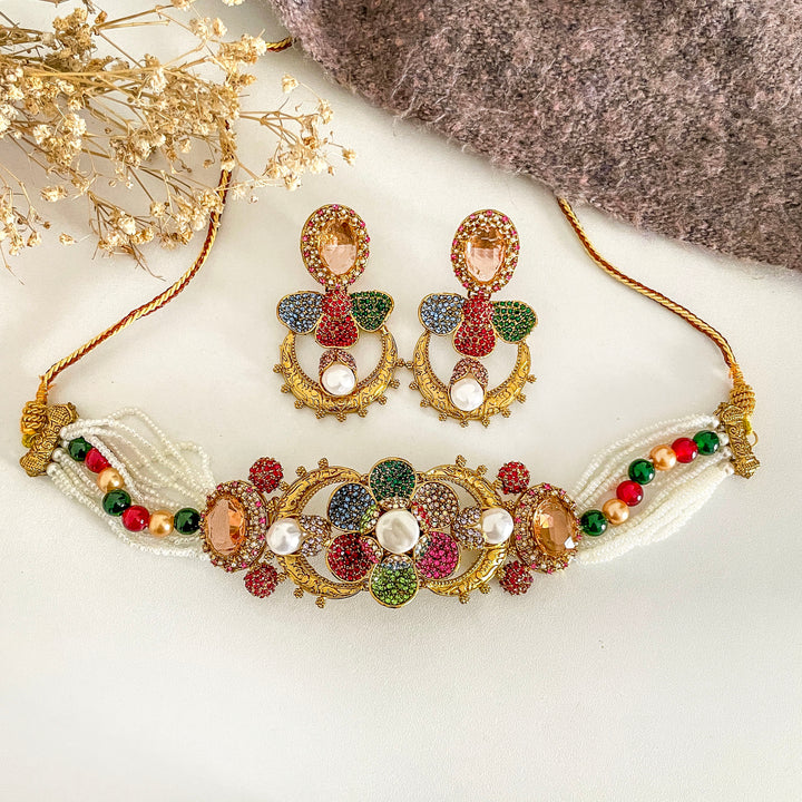 The choker unveils a symphony of floral motifs, each petal sculpted with meticulous pavé work, embracing luminous pearl-like orbs at its heart. Multi-strand beads flow like gentle rivers on either side, framing the centerpiece in balance and grace. The accompanying earrings echo this harmony—crescent arcs crowned with blossoms shimmer as if dipped in color and light.