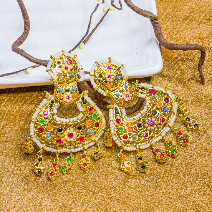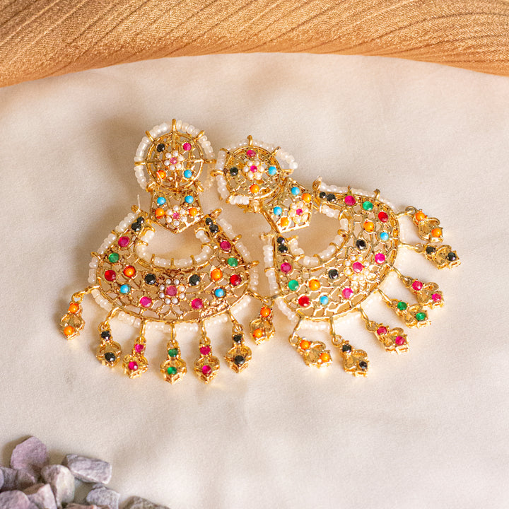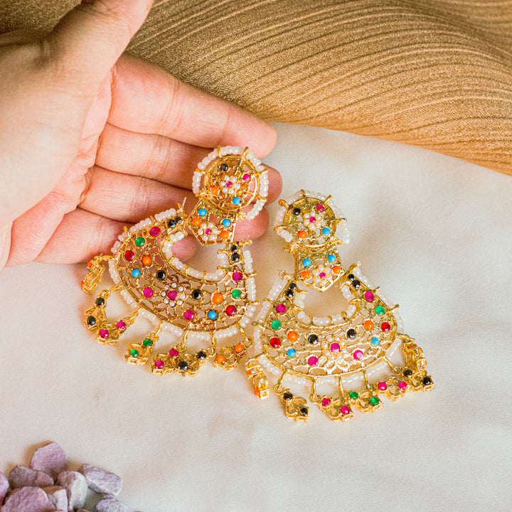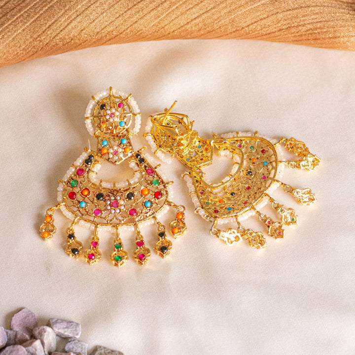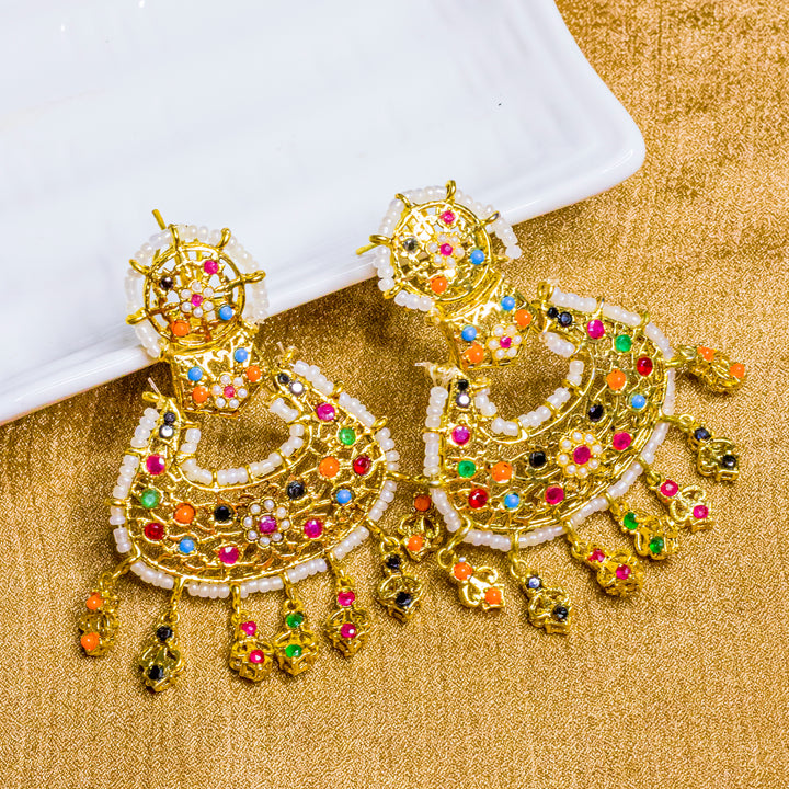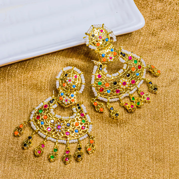 Brighten up your jewelry collection with the stunning Nauratan Earrings. These traditional gold-toned earrings feature a dazzling array of colorful stones, intricately set in an ornate design inspired by classic Nauratan artistry. Adorned with tiny pearls and vibrant gems, these statement earrings bring festive elegance to any outfit. Perfect for weddings, festive occasions, or cultural events, the Nauratan Earrings are your go-to accessory for a bold and timeless look.