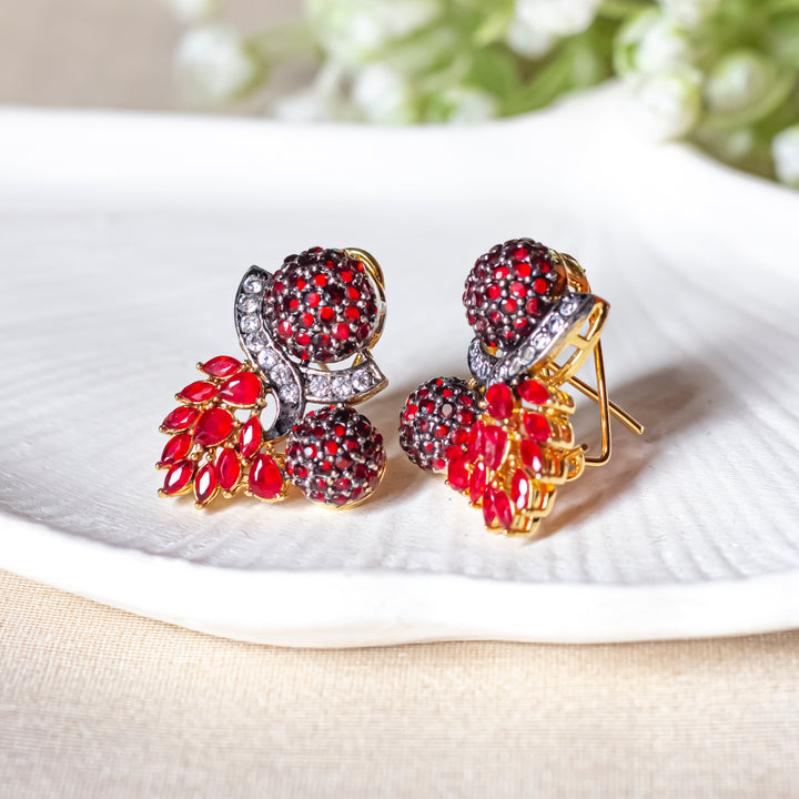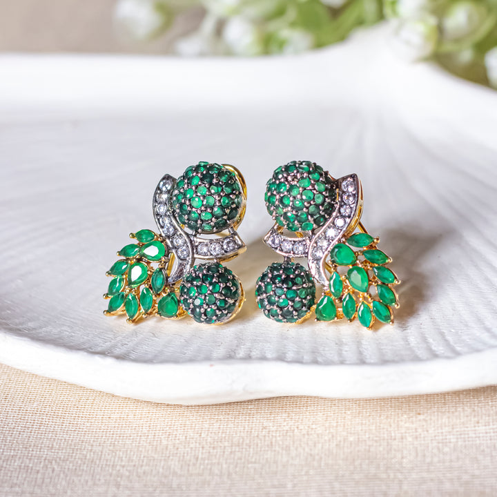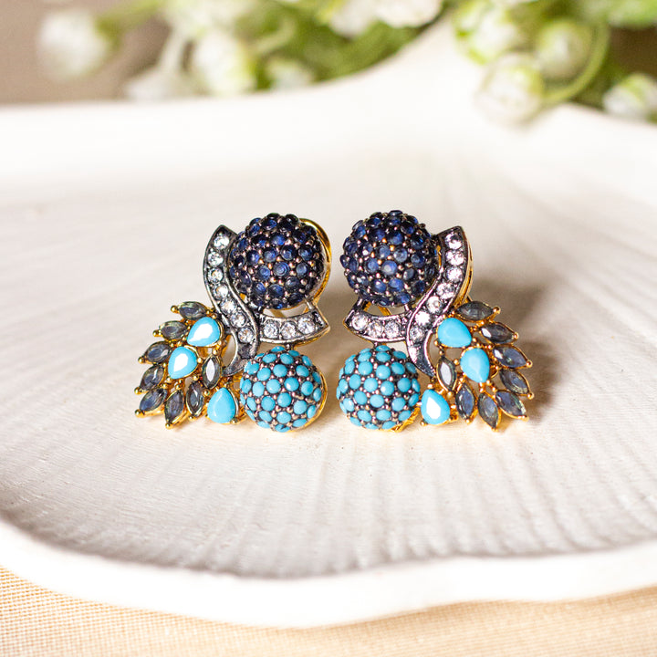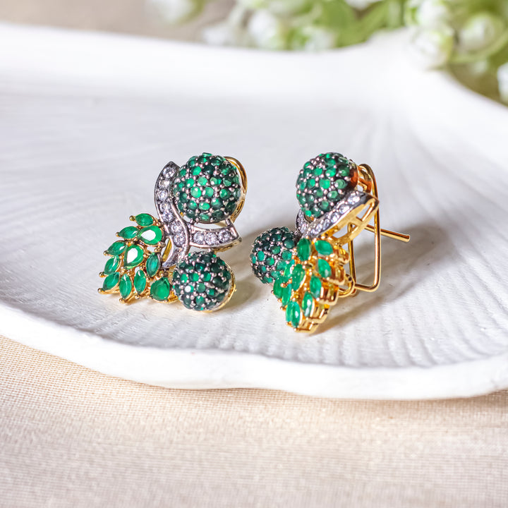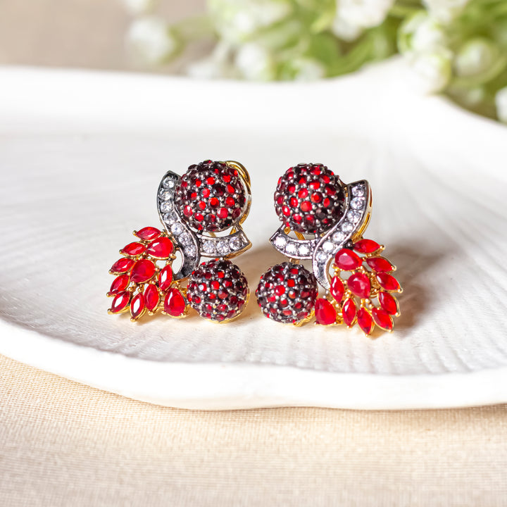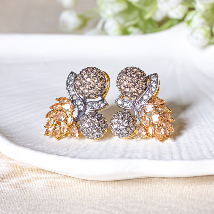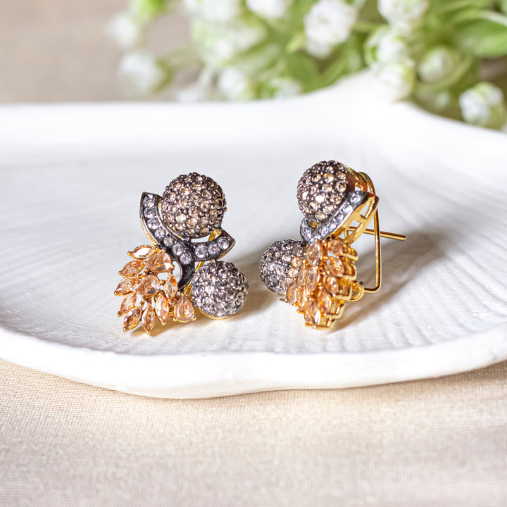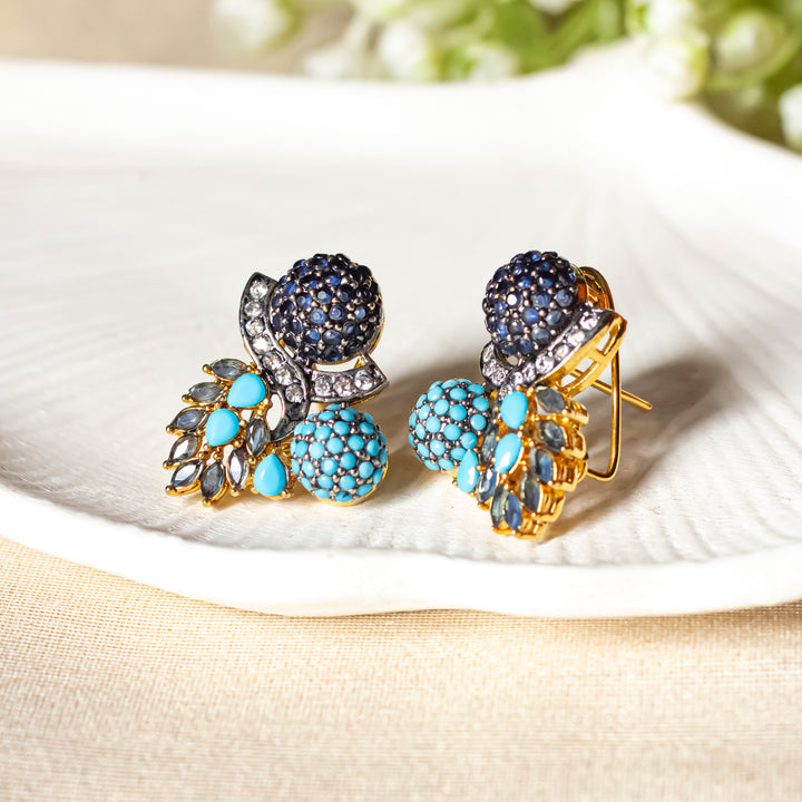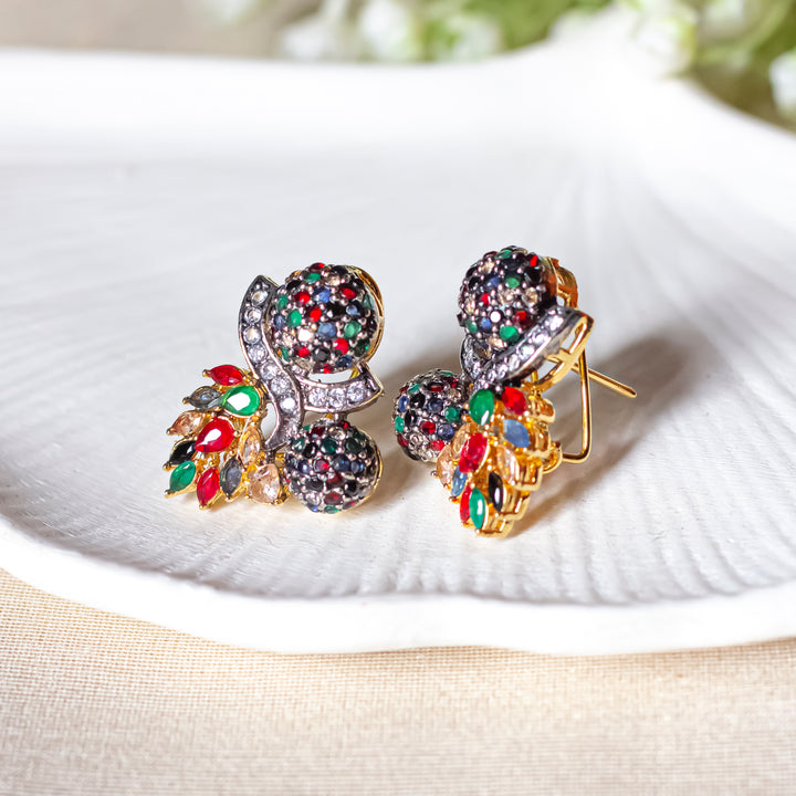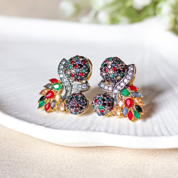 Elevate your style with the exquisite Gulwara Earrings, a stunning testament to intricate craftsmanship and vibrant design. These captivating earrings feature a unique cluster design, combining a delicate interplay of paved spherical elements and striking marquise-cut stones. Each pair is meticulously crafted to offer a luxurious and eye-catching accessory for any occasion, truly making them one of a kind.