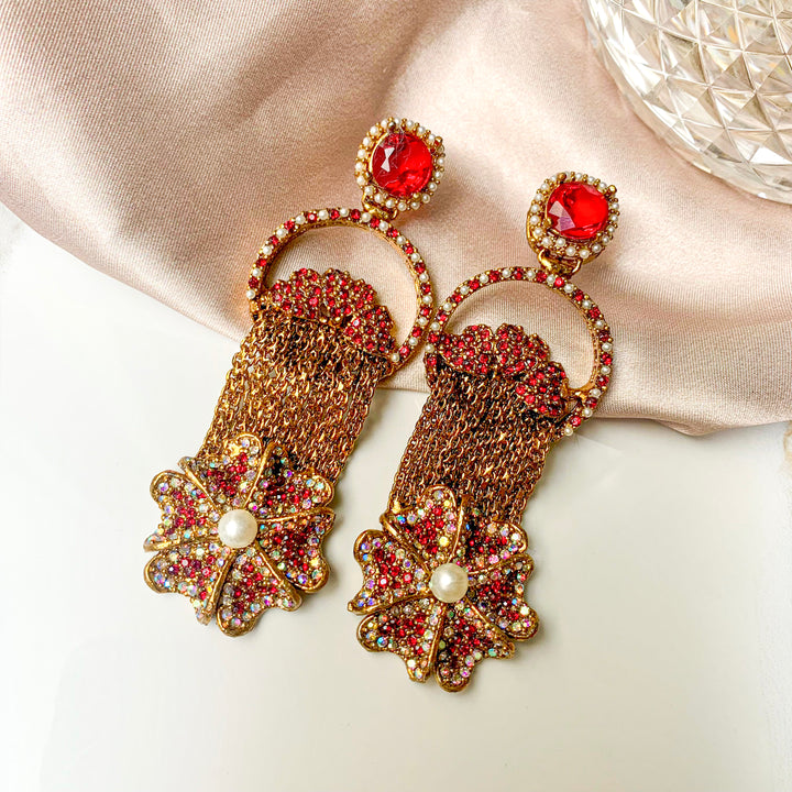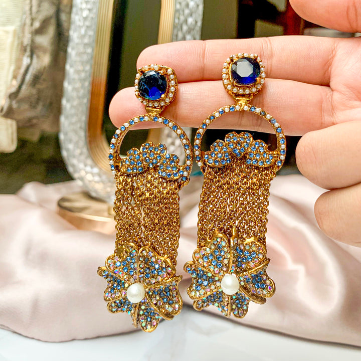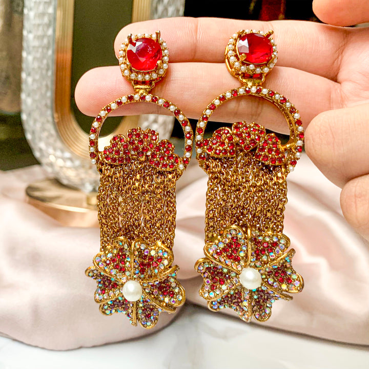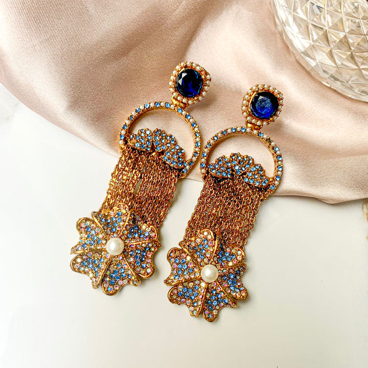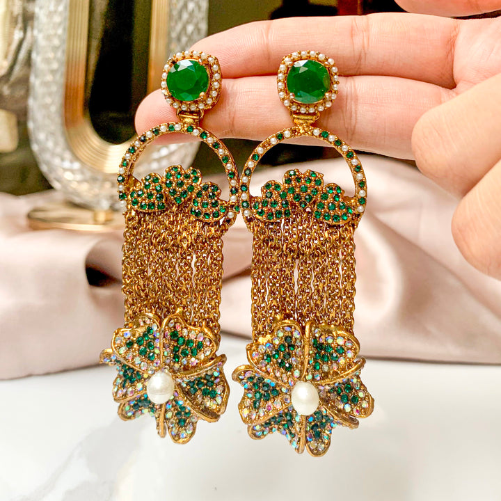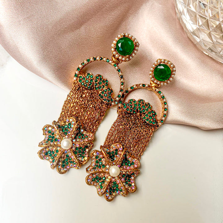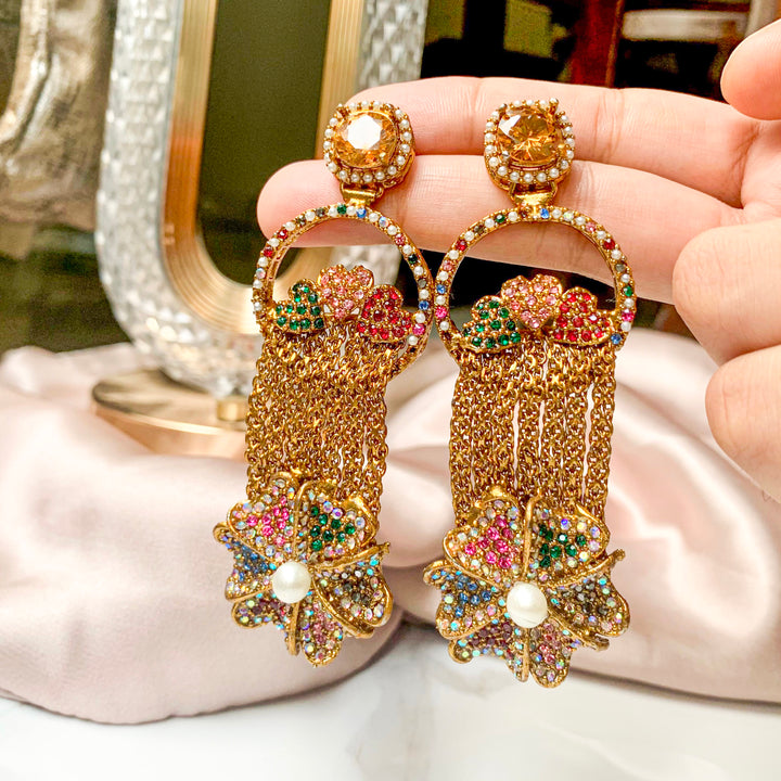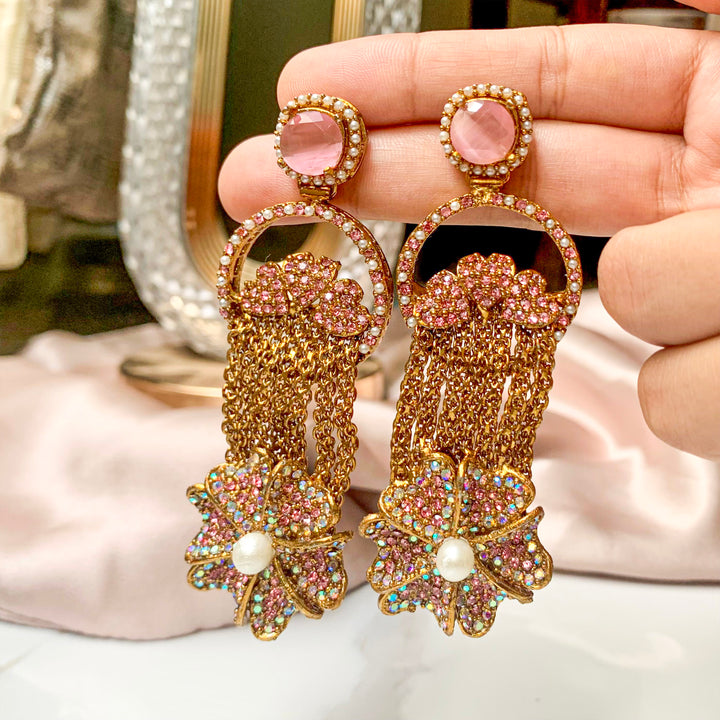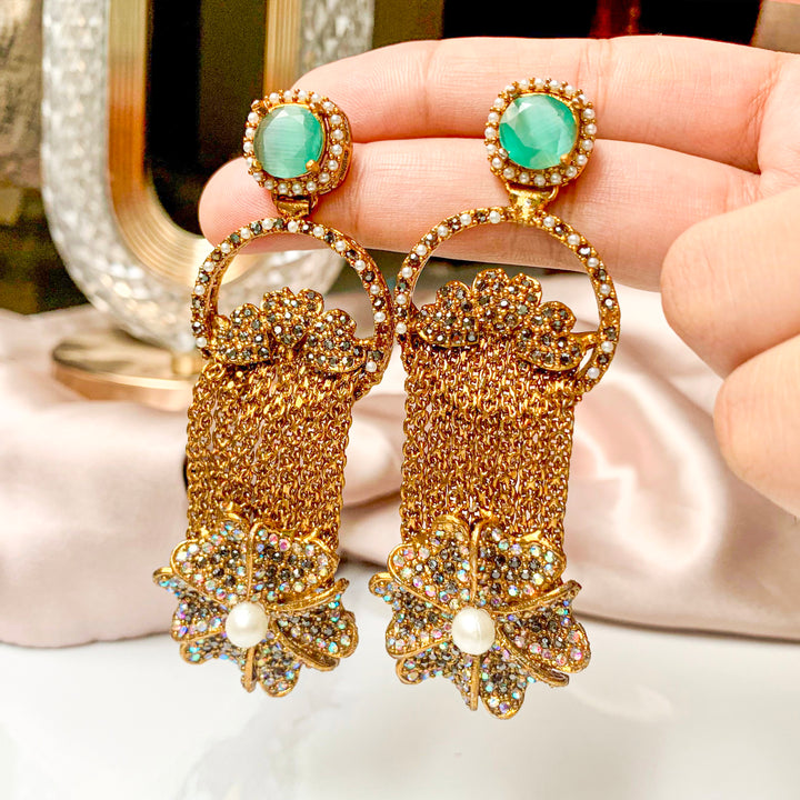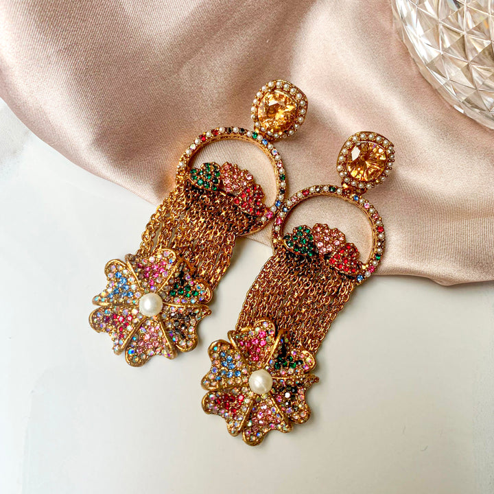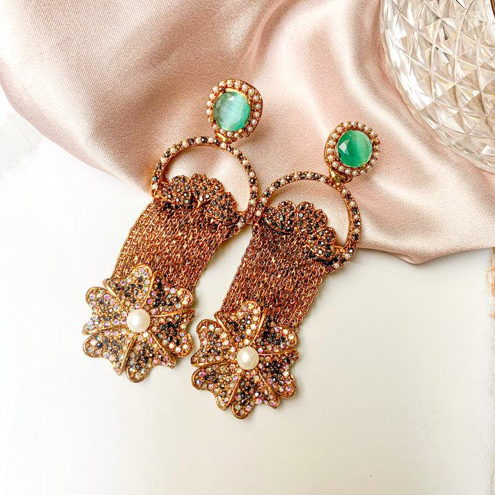 A poetic bloom in motion, Raqs-e-Gulzar captures the quiet grace of petals mid-sway and chains that shimmer like verses in gold. Its delicate, dangling silhouette moves like choreography—each step awakening a soft sparkle, each sway echoing a garden’s rhythm. At its heart lies a luminous pearl, embraced by a tapestry of crystals and timeless craft. Designed to move with you—softly, luminously, effortlessly.