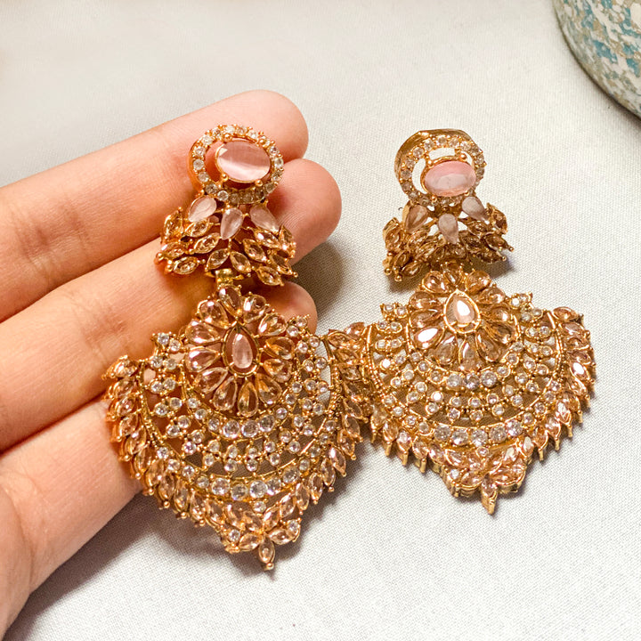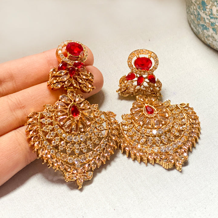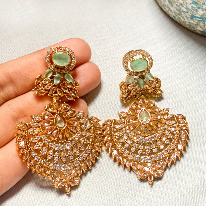 Embrace the timeless elegance of the Chandni Moonlight Glow Earrings, inspired by the ethereal beauty of moonlight. These intricately designed earrings feature dazzling crystal embellishments set in a luxurious gold-tone finish, creating a radiant sparkle with every movement. Their grand chandelier style exudes grace and royalty, making them the perfect accessory for weddings, festive occasions, and evening soirées. Elevate your jewelry collection with this masterpiece of craftsmanship.