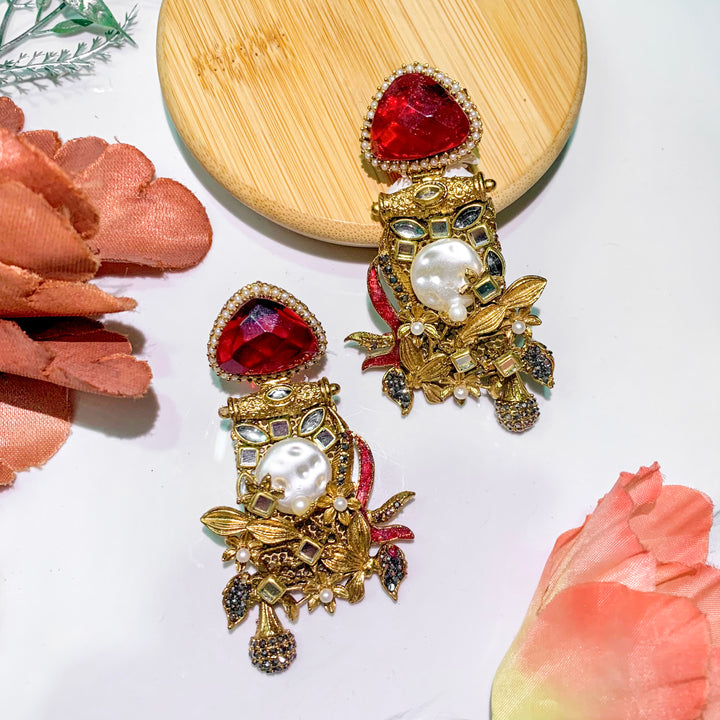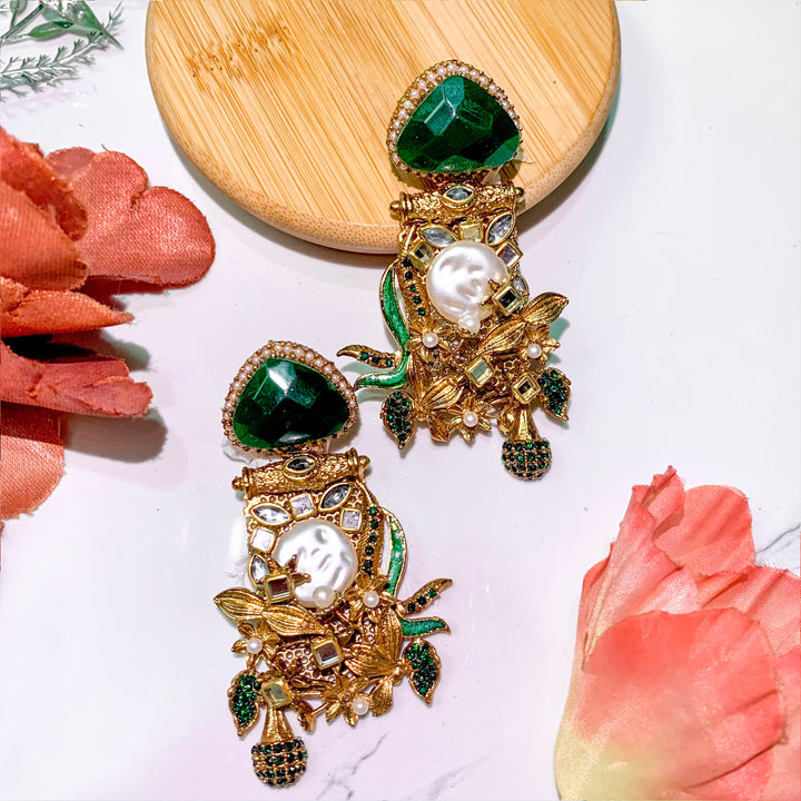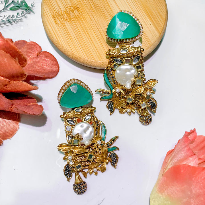 Elevate your elegance with the Noor e Nazar Betel Leaf Stone Earrings - ER-88, a stunning blend of tradition and modern charm. These intricately designed earrings feature a captivating betel leaf motif, adorned with lustrous pearls, sparkling stones, and gold-tone accents. The rich color variations complement any outfit, making them a versatile addition to your jewelry collection. Whether for festive occasions, weddings, or an elegant evening out, these earrings add a regal touch to your look.