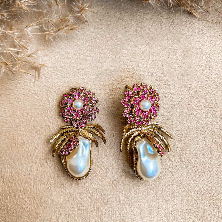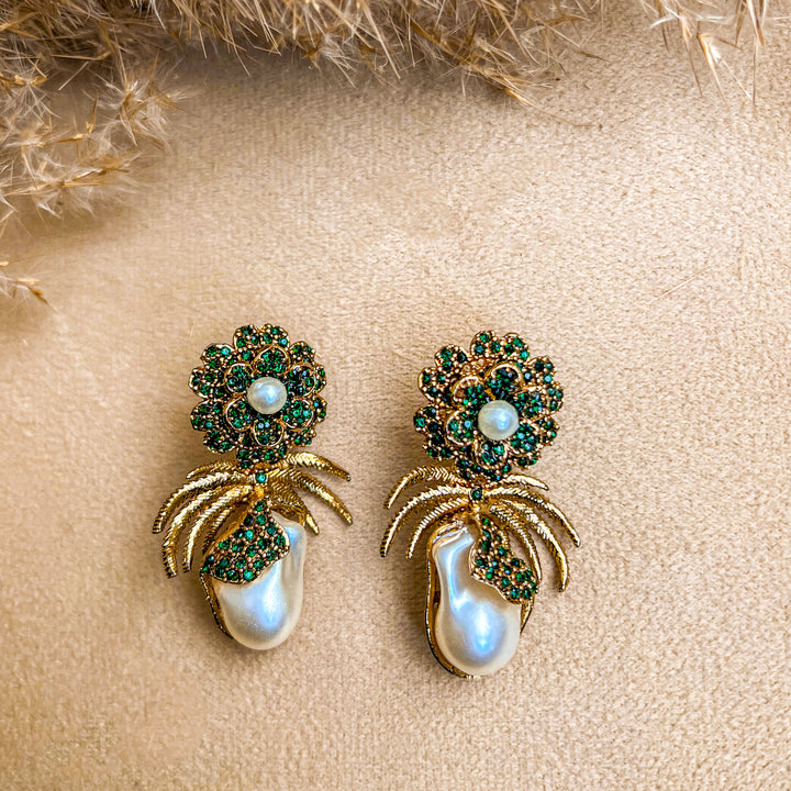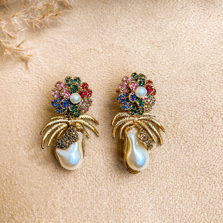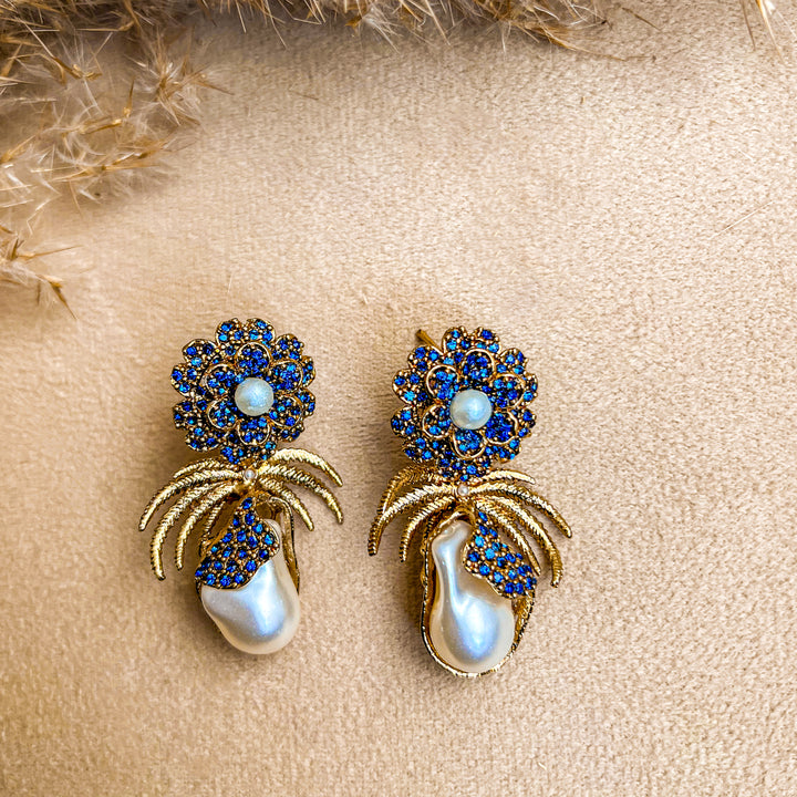 Embrace timeless elegance with the 'Mushk e Moti Flower Pearl Earrings. These exquisite earrings feature luminous, teardrop-shaped 'Mushk e Moti' (musk pearls), known for their subtle, captivating fragrance. Each pearl is nestled within a meticulously crafted golden setting, adorned with vibrant blue stones that form a delicate floral motif. The design is further enhanced by stylized golden palm fronds, creating a unique blend of nature-inspired beauty and classic sophistication. Perfect for special occasions or adding a touch of refined glamour to your everyday style, these earrings are a testament to exquisite craftsmanship and the allure of 'Mushk e Moti'."