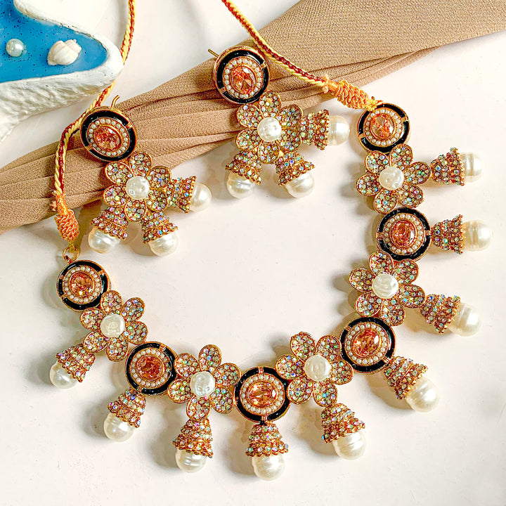 Design: Floral Cluster Necklace Set with Stone, Crystal, and Pearl Drops