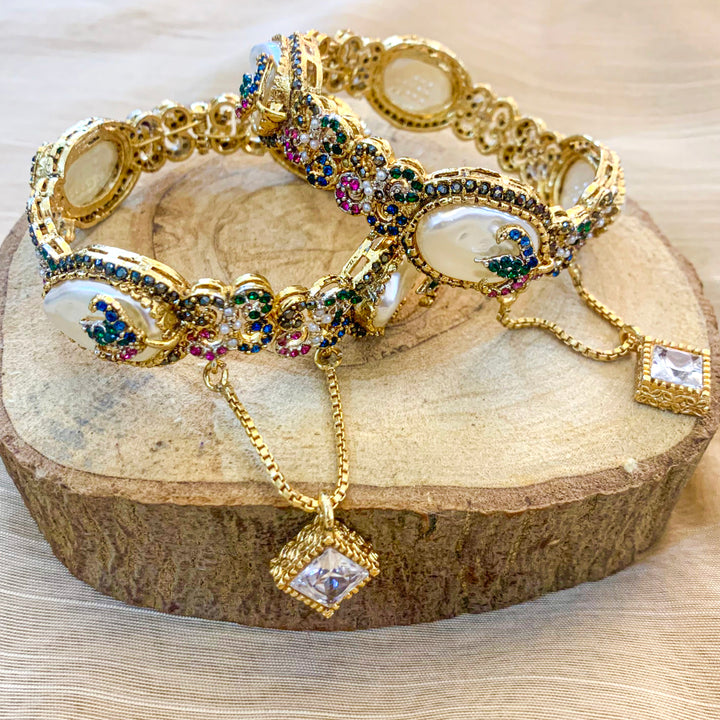 Embrace the allure of the moon with these exquisite Gulzaar Moonstone Bangles. Crafted with intricate designs and adorned with shimmering moonstones, these bangles exude a sense of ethereal elegance. The rich gold tone adds a touch of luxury, making them a perfect accessory for any special occasion or to elevate your everyday style.