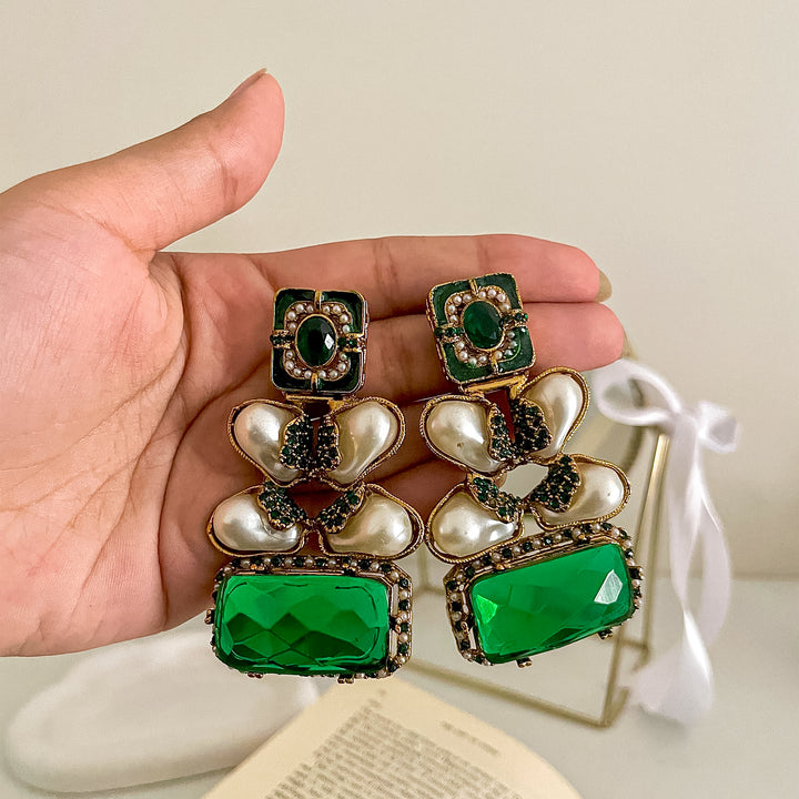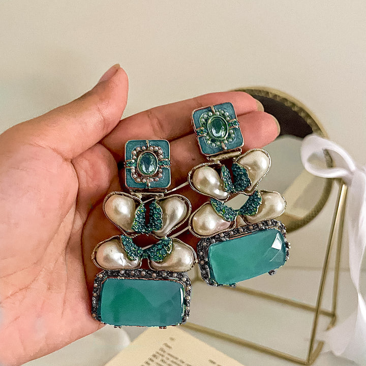 Immerse yourself in the exquisite beauty of the Mehr-Meena Gemstone Symphony earrings. These stunning earrings showcase the intricate artistry of Meenakari, a traditional Indian enameling technique, combined with the brilliance of precious gemstones. The delicate Meenakari patterns, adorned with vibrant colors, create a captivating visual spectacle. The earrings feature a symphony of gemstones, including dazzling diamonds, sparkling emeralds, and luxurious pearls, adding a touch of opulence and elegance.