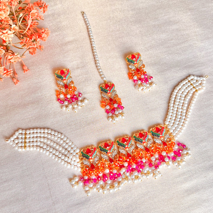 Design: Floral & Pearl Choker Set with Stone & Bead Accents