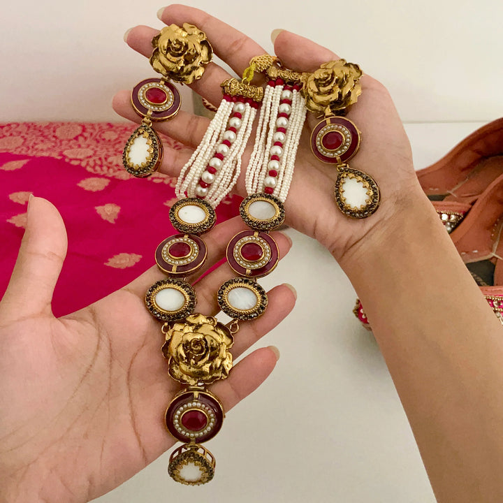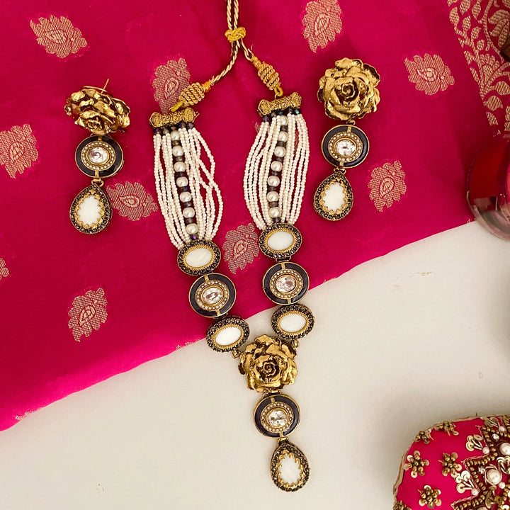 - Pearls and Gemstones: The choker and earrings are embellished with lustrous pearls and sparkling gemstones, adding a touch of luxury and glamour.