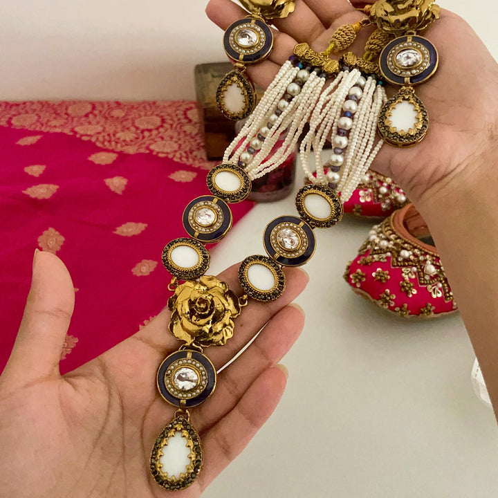 The Noor-e-Jahan Half Meena Set is a stunning and elegant piece of jewelry inspired by the rich heritage of the Mughal Empire. This set features a delicate choker adorned with intricate meena work, pearls, and a beautiful floral pendant. The matching earrings complete the set, creating a harmonious and sophisticated look.