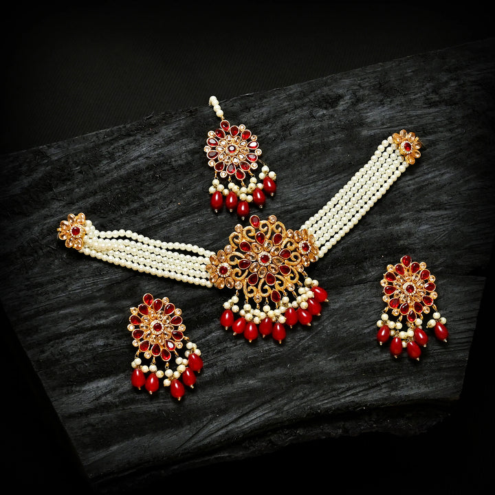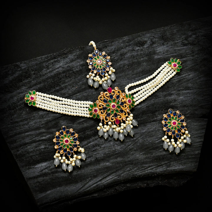 A Zircon Choker set typically comprises a necklace and matching earrings adorned with zircon gemstones. Zircon is a brilliant, diamond-like gemstone known for its luster and sparkle. Here's a detailed description of a Zircon Choker set: