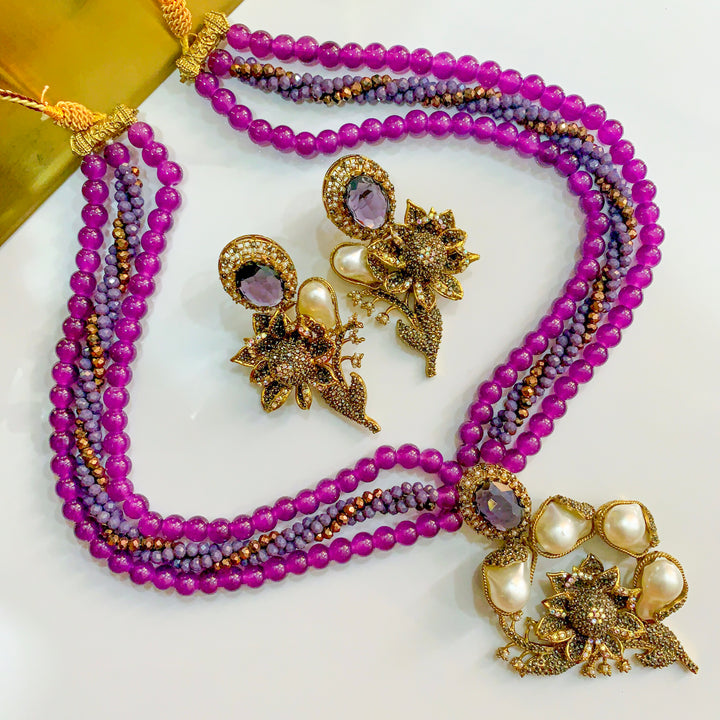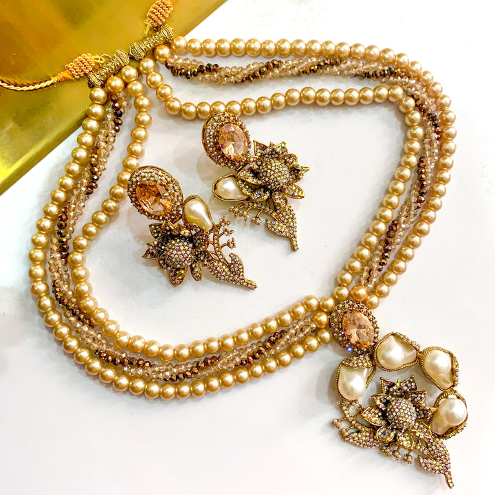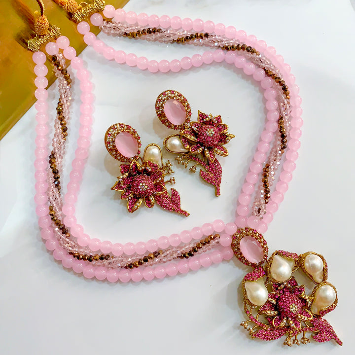 The design unfurls in layered strands, each bead a soft echo of earth’s abundance. At its heart rests a floral medallion, petals glistening with delicate pavé work, framed by luminous pearl-like droplets that catch the light like morning dew. Matching earrings carry the same botanical grace, their blossoms opening toward the gaze, every curve traced with artisan precision. The tones move with organic depth, weaving richness and softness into a single, flowing statement.