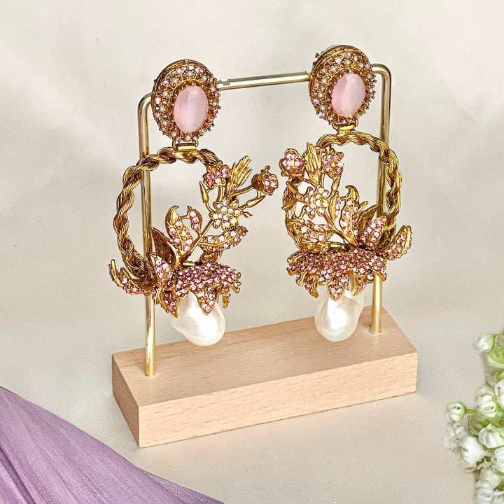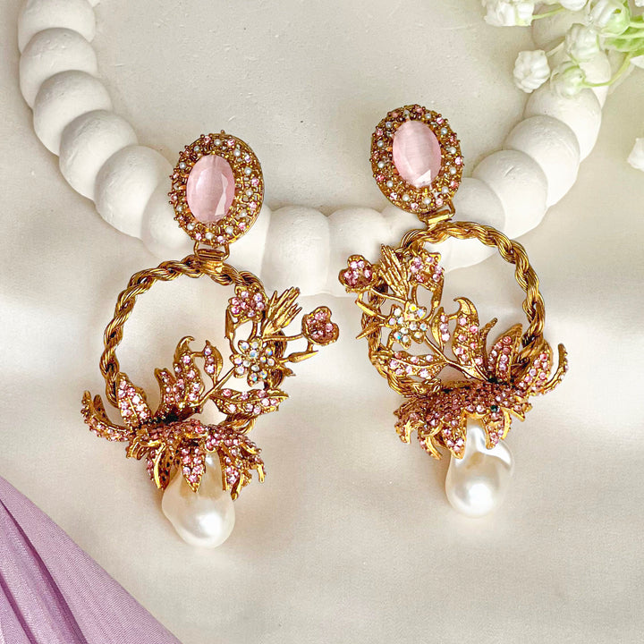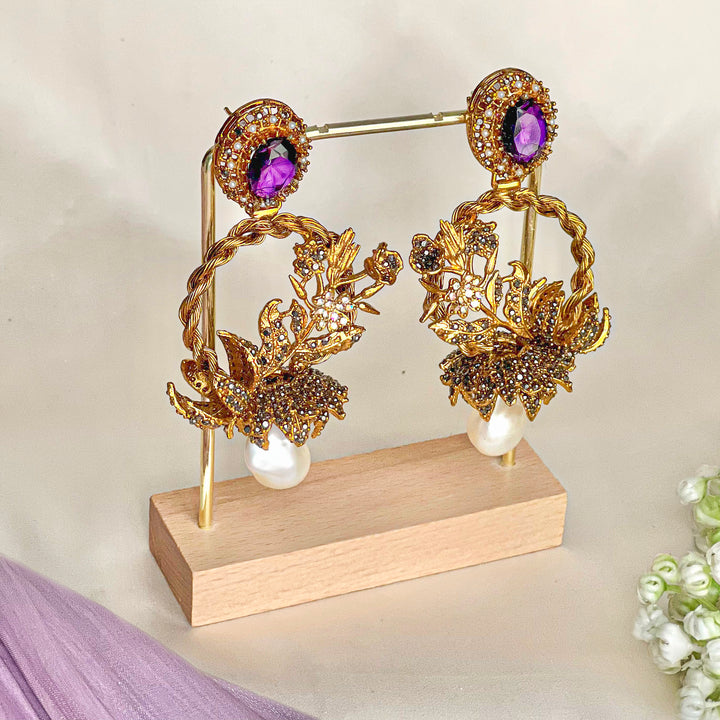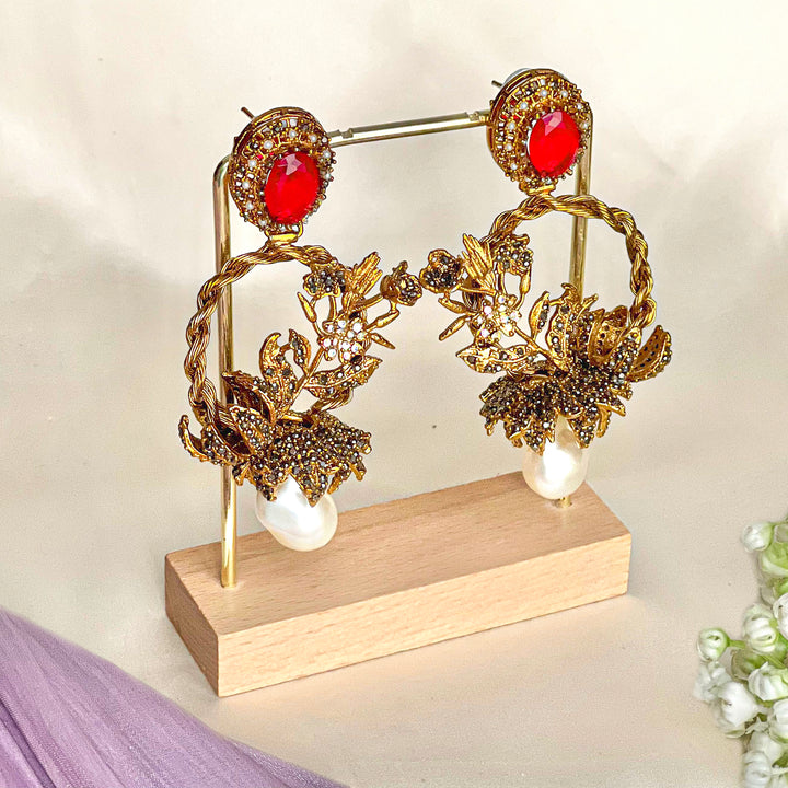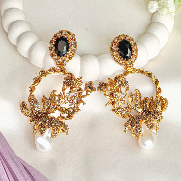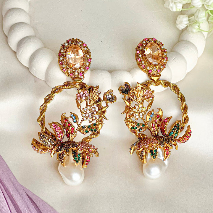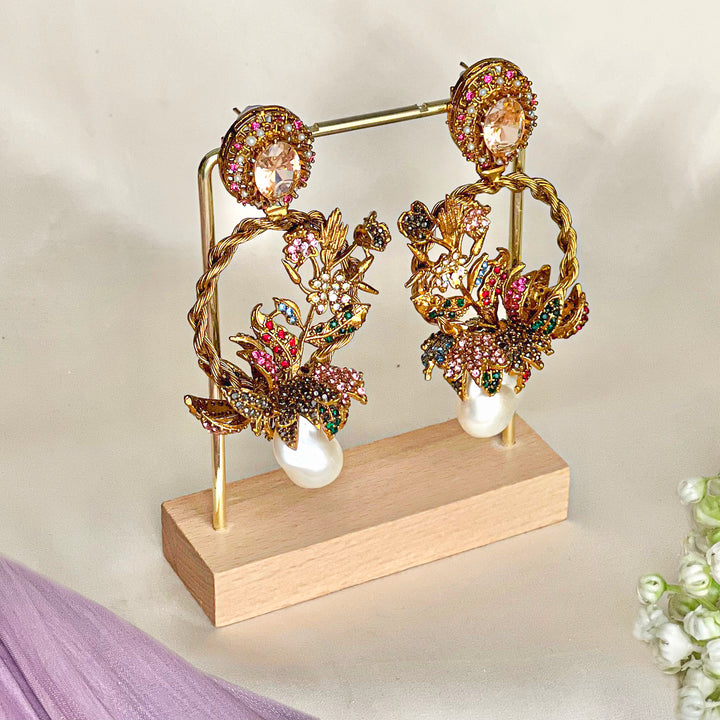 Design: Ornate Hoop Drop with Floral Motif, Multi-Stone, and Pearl Accents