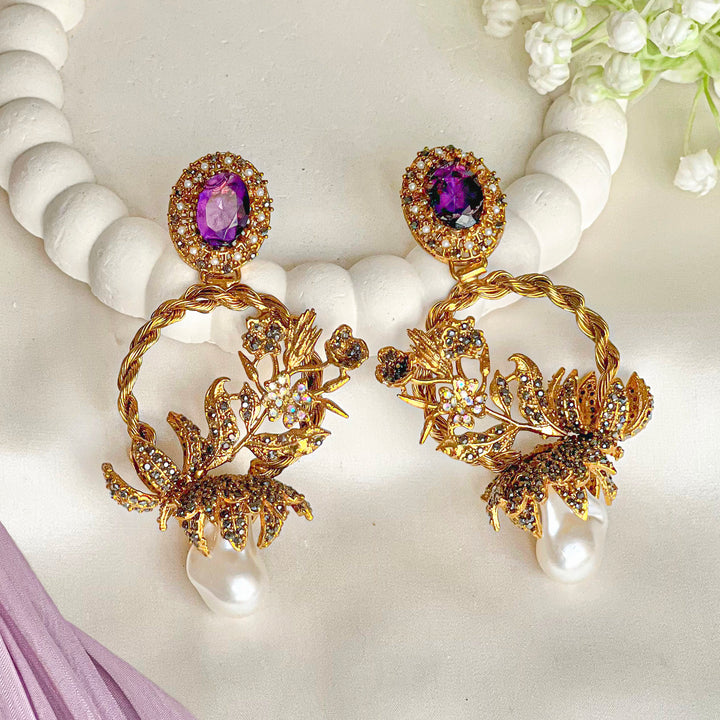 The design features a prominent central stud, which reflects a deep, intense hue and is framed by delicate, brilliant crystals. From this anchor, a textured, gilded hoop descends, serving as a canvas for intricate metalwork. The hoop is adorned with lavish, leaf-and-vine motifs that scatter into a profound array of darker-toned crystals, culminating in a serene, luminous orb. This exquisite construction achieves a breathtaking balance between bold texture and ethereal shimmer.