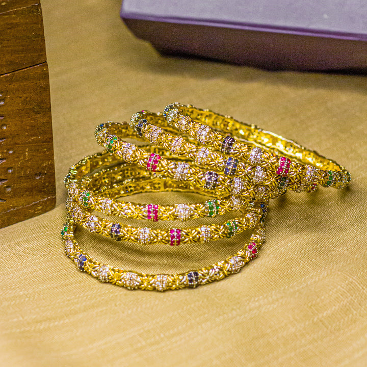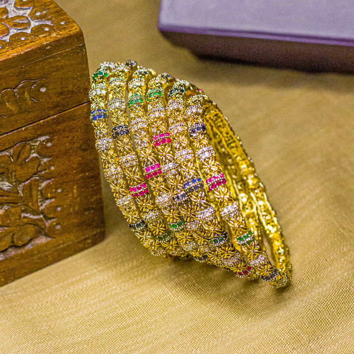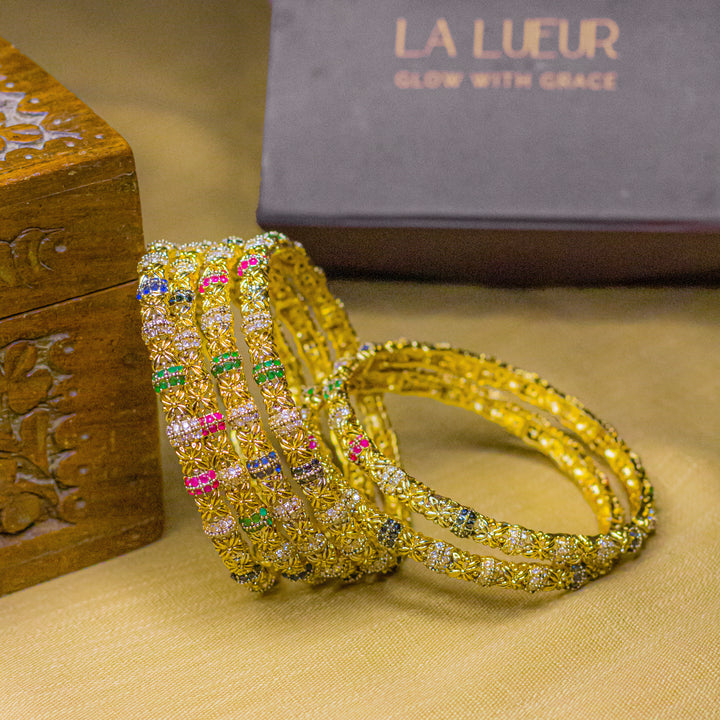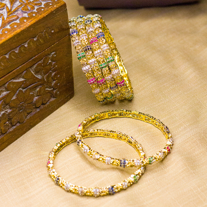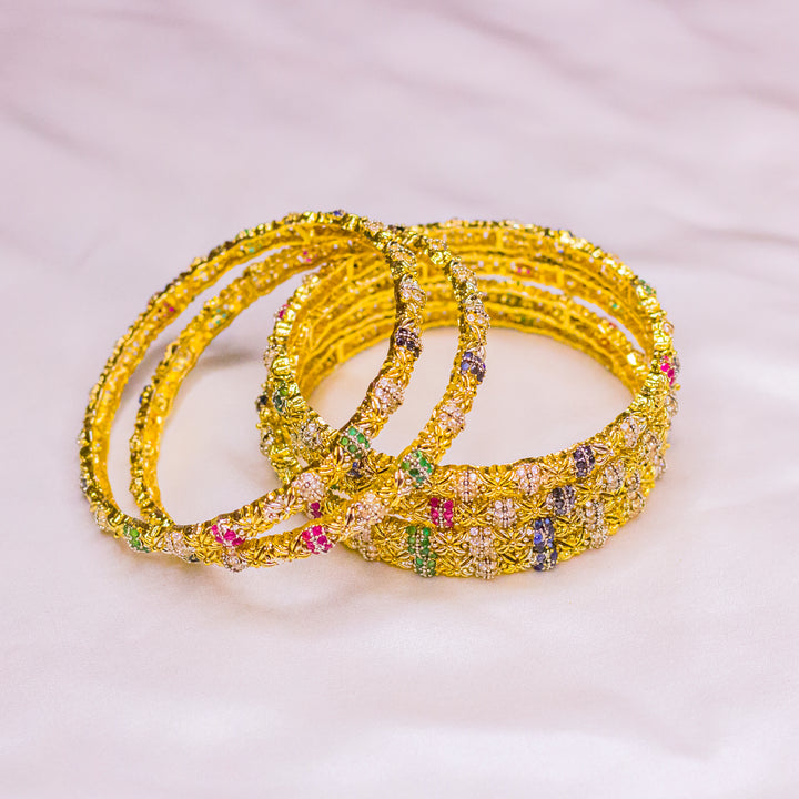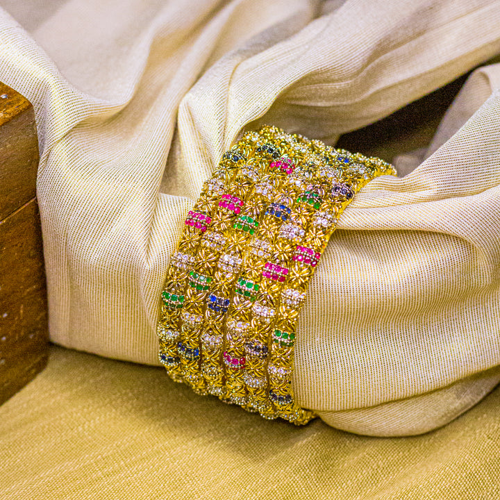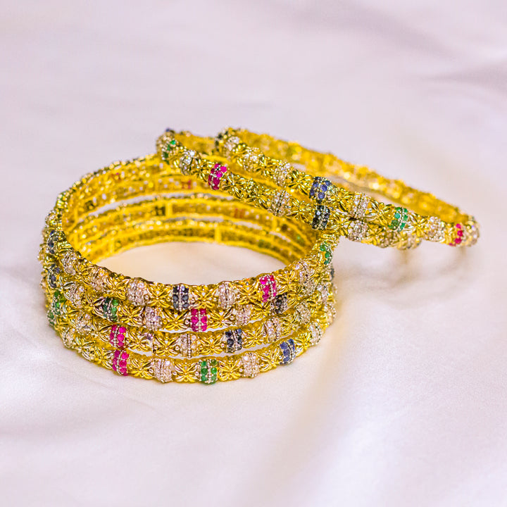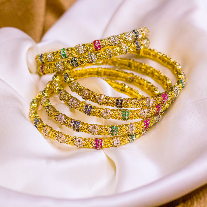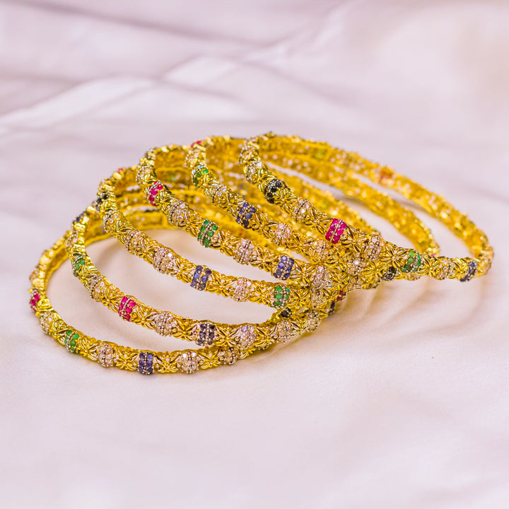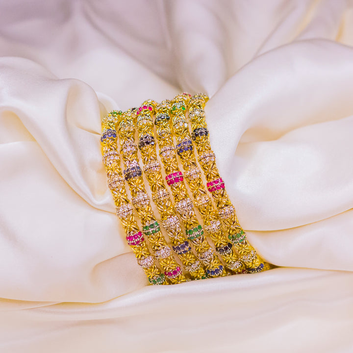 Elevate your jewelry collection with the Zarmina Bangles Pack of 6 . These exquisitely crafted gold-toned bangles feature intricate floral designs accented with dazzling multi-colored stones, creating a perfect blend of tradition and elegance. Designed for festive occasions, weddings, and cultural celebrations, this set of six bangles offers versatile styling options to complement both traditional and contemporary outfits. Lightweight yet richly detailed, the Zarmina Bangles add a timeless charm to any look.